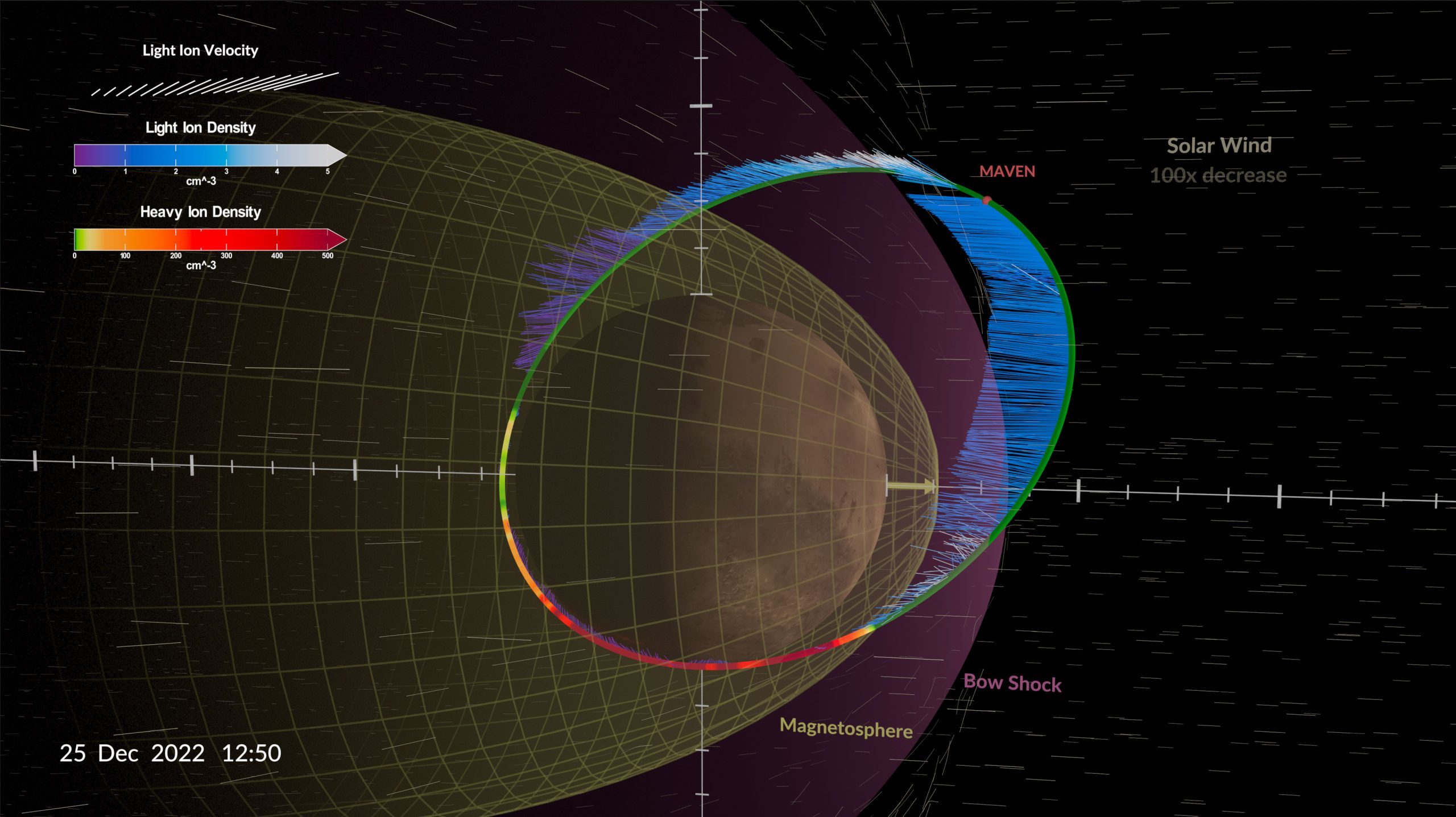 This data visualization depicts a period of decreased solar wind at Mars that occurred on December 25, 2022, causing the planet’s magnetosphere to expand outward. Ion velocity and density data collected by the MAVEN spacecraft is presented using a color-mapped satellite orbit tail and vectors along MAVEN’s orbit.