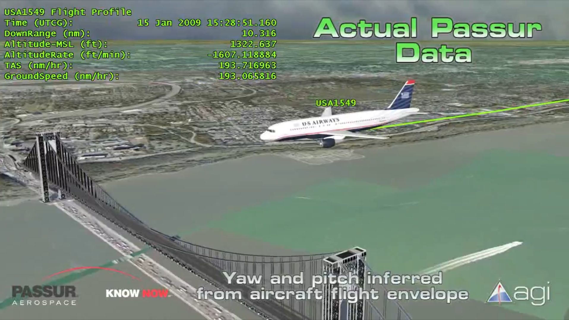 This video depicts the flight path of US Airways flight 1549 using actual flight data recorded by PASSUR Aerospace, Inc. This animation was used by major news organizations (CNN, FOX, MSNBC, etc) covering the story, and was shown on national television. I also presented this video at SIGGRAPH 2010 as part of the SIGGRAPH Dailies! program. This technical animation was created using Satellite Tool Kit.