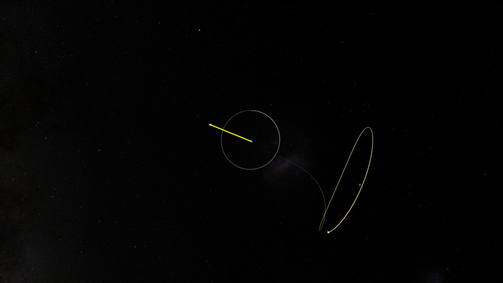 This visualization begins with a top-down view of the Earth-Sun system, with Lagrange points L3, L4, and L5 labeled. A magnified view of Earth appears, showing L1 and L2. The camera pushes into Earth as the James Webb Space Telescope is launched. The camera pulls back to a top-down view as JWST arrives at L2. A yellow arrow points to the Sun’s position. The camera shifts to an oblique view of the orbit before transiting to a view fixed on the Sun-Earth axis, showing how L2’s position is affected by the moon’s orbit around the Earth.