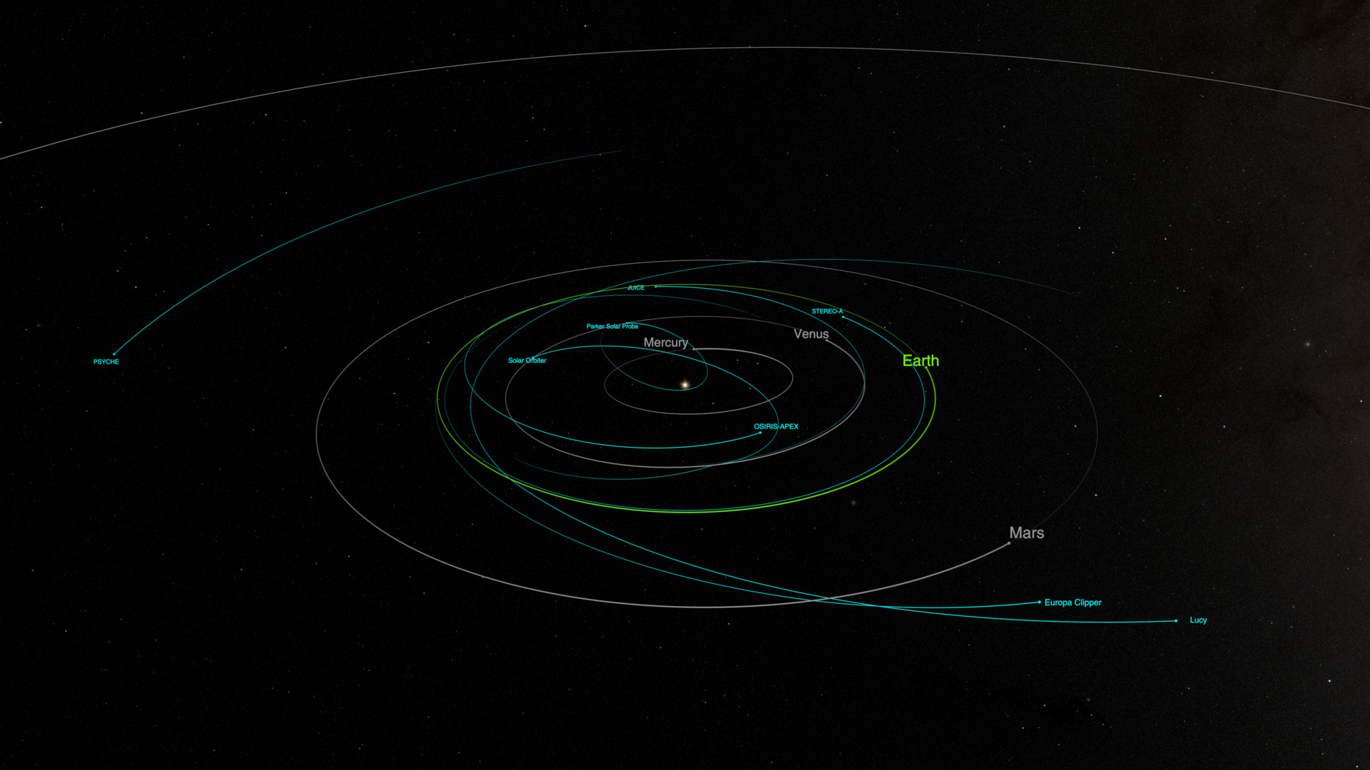 This visualization is a tour of the Solar System, showing all of NASA’s active satellites as of July 2025. It begins near Earth, highlighting satellites in orbit around the planet. The camera then pulls back to reveal satellites at the Moon, L1, and L2. A thin yellow line indicates the direction of the Sun, showing the spatial relationship between the Sun, Earth, and Lagrange points. The view expands to show the inner Solar System, then zooms in on Mars to highlight its active satellites. From there, the camera moves out and in toward Jupiter to show Juno, the only active satellite currently orbiting the planet. The tour continues to the edge of the Solar System, revealing NASA’s most distant active spacecraft: Voyager 1, Voyager 2, and New Horizons. The video ends by returning to Earth.