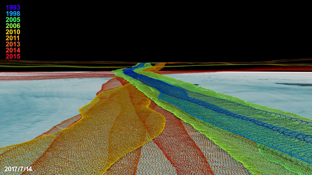 This visualization explores 25 years of elevation measurements from the Airborne Topographic Mapper over the Rink glacier in Greenland. Each year is color-coded with blues representing the oldest data and red representing the newest. The camera zooms in to a view comparing data collected from many aircraft flights over the same region, showing the ice loss over several years. The camera then zooms out to see the coverage pattern for ICESat-2, which will study ice loss on a global scale.