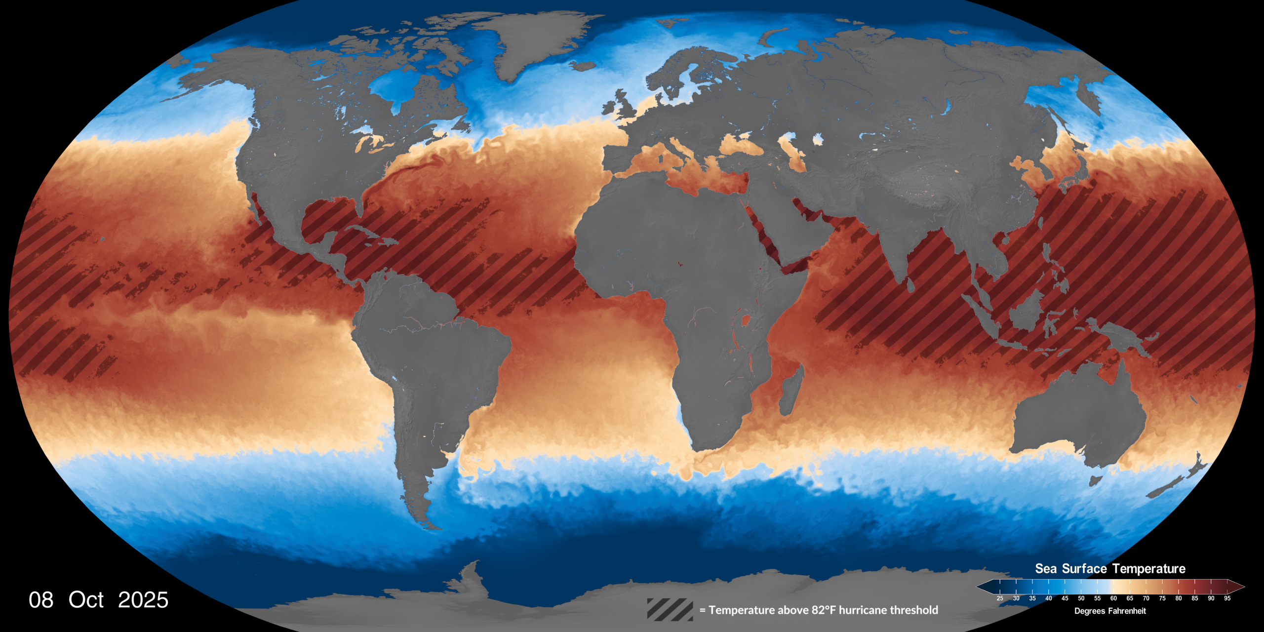 This automated visualization shows global sea surface temperature using JPL’s MUR dataset, updated daily with the latest available data. It renders multiple map projections and includes an overlay highlighting ocean regions above 82°F, the threshold where warm waters can intensify tropical storms and hurricanes.