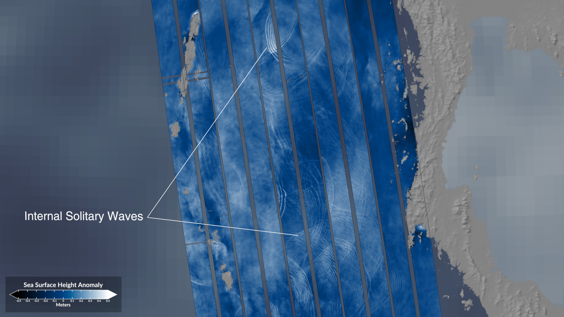 This visualization reveals ocean surface phenomena captured by NASA’s SWOT (Surface Water and Ocean Topography) satellite. Beginning with a global perspective of conventional sea surface height anomaly (SSHA) data, the animation then showcases SWOT’s orbital path and ground swath coverage (displayed in orange). As the view transitions to select regions of interest, SWOT’s high-resolution SSHA measurements unveil detail impossible with previous satellite technology. The visualization clearly distinguishes ocean surface waves, internal solitary waves, and submesoscale eddies—critical features for understanding ocean dynamics and energy transfer. The color gradient ranges from dark blue (representing lower surface heights) to white (indicating higher surface heights), allowing viewers to immediately grasp the three-dimensional nature of these ocean phenomena.