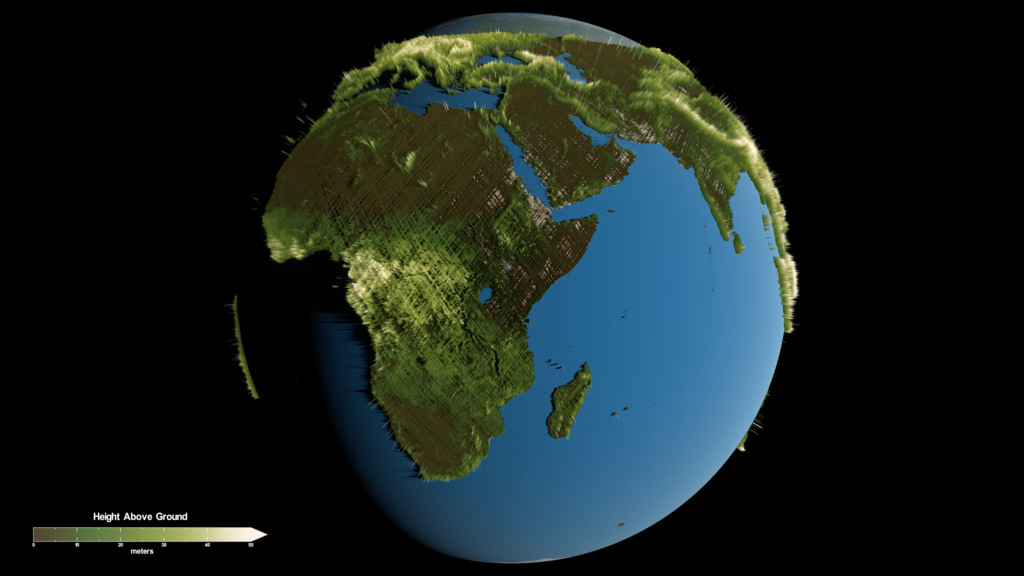 This visualization depicts a global view of forest height data collected by the GEDI instrument aboard the International Space Station. Brown and dark green represent shorter vegetation. Bright green and white represent taller vegetation. This visualization uses data collected between April 2019 and April 2020. Height is exaggerated to depict variation at this scale.