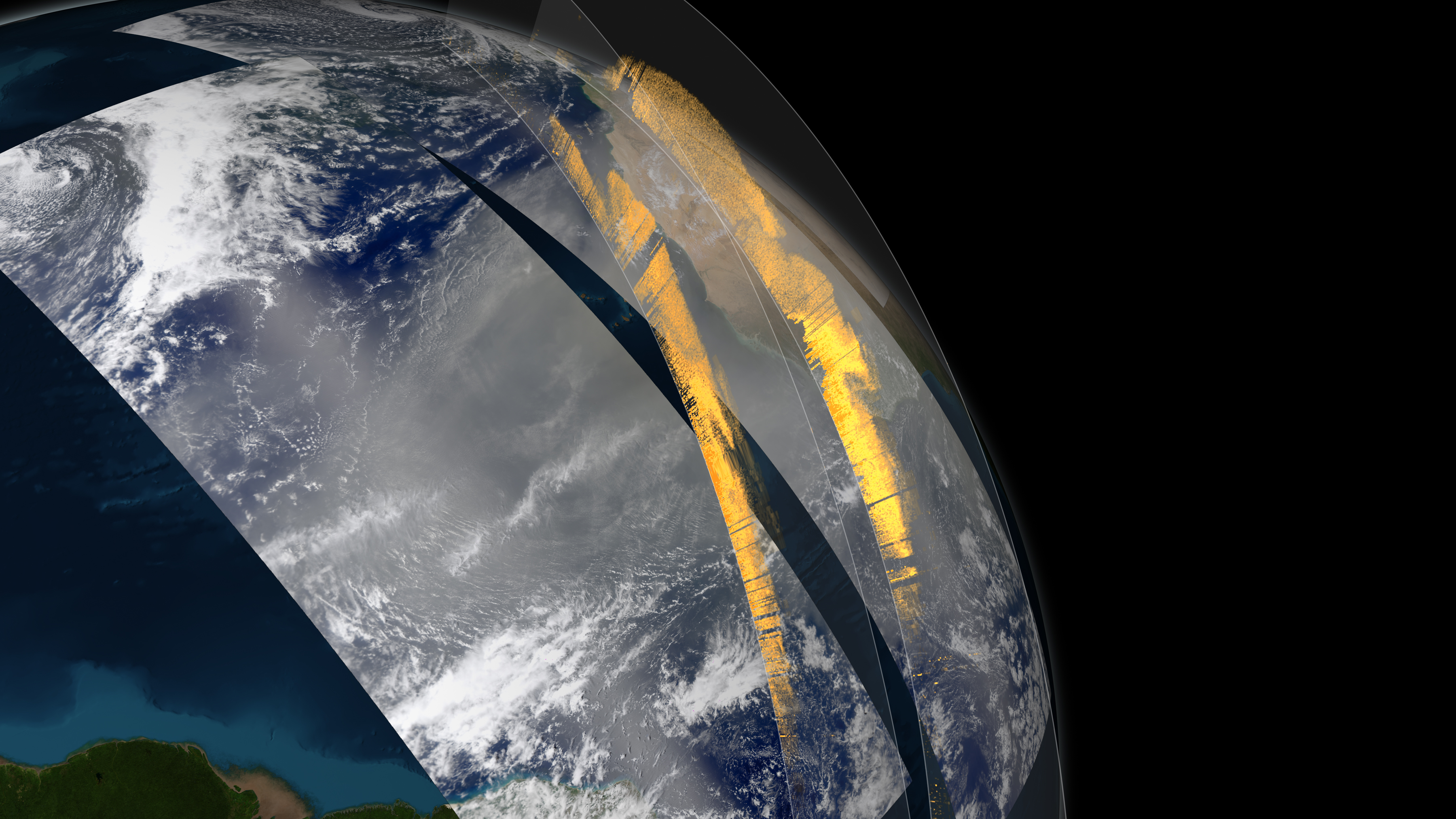 These visualizations were created to tell the story of African Dust. The textures on the vertical walls were created using data from NASA’s CALIPSO satellite, which measures aerosols in the atmosphere. These walls are compared with the satellite imagery taken from the same time period. The hazy brown sections of the images are where dust is present in the atmosphere. Viewing the CALIPSO data walls sequentially allows us to follow the dust as it travels across the ocean and makes it’s way toward South America.